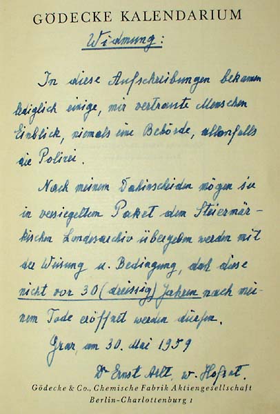 | Abbildung 1: Widmung im Tagebuch, das Arlt in einem Kalender aus dem Jahre 1940